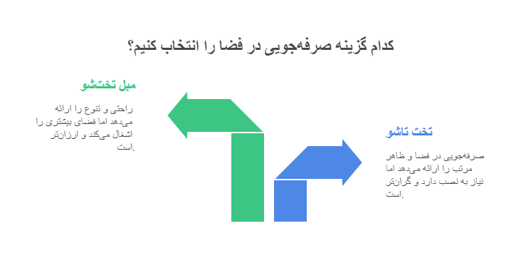 اگر خانهی شما کوچک است و میخواهید اتاقتان چند منظوره باشد، تخت تاشو بهترین گزینه است. اما اگر فضای متوسطی دارید و دنبال راحتی بیشتری هستید، مبل تختشو انتخاب بهتری است.
